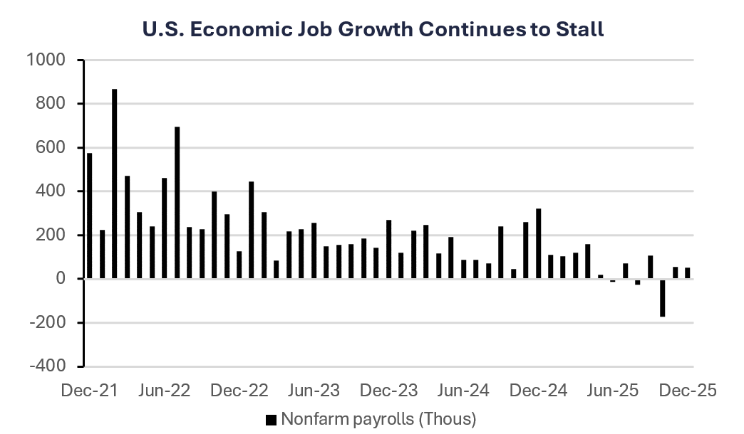 The U.S. economy added fewer jobs than expected in December (50K vs. 55K est.). The unemployment rate decreased marginally to 4.4% (from 4.5%). For the year, the economy added only ~1.44 million jobs, the weakest annual job growth since 2020.