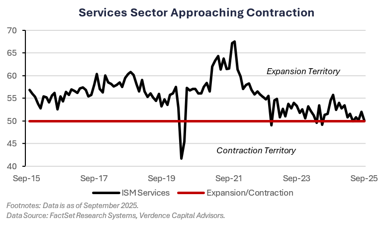 Activity in the services sector dipped in September according to the ISM Services Index and is dangerously close to contraction territory (a level below 50). New orders led the weakness while employment continues to contract. The prices paid component jumped which suggests inflation is still a concern.